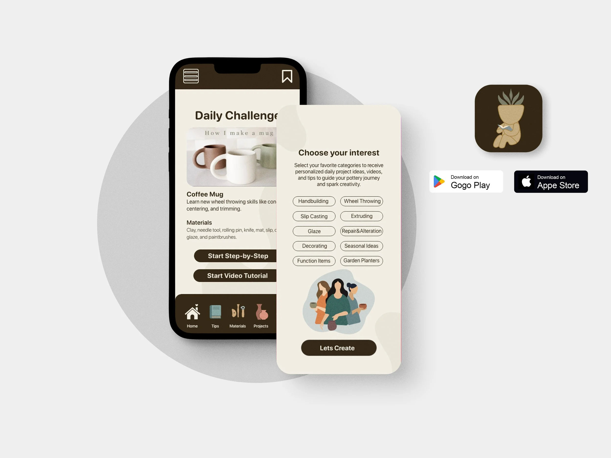 Type uses SF Pro Rounded for a soft, approachable feel, paired with detailed vector illustrations and an earth-tone palette to create a clean, natural pottery app aesthetic.