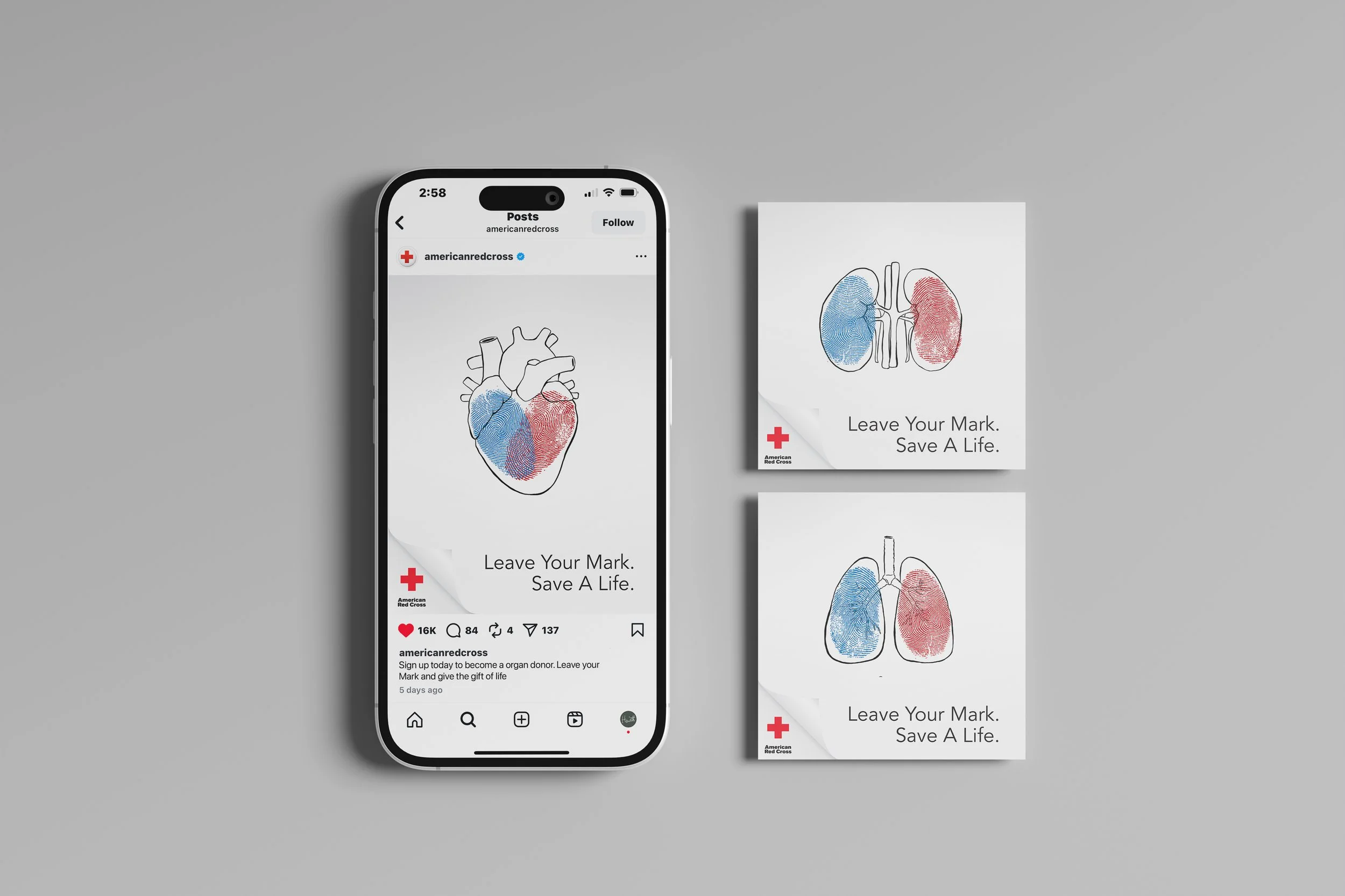 The organ donation PSA campaign for the American Red Cross raises awareness through a visually striking and emotionally driven concept centered on the idea of leaving a lasting impact. Using fingerprint-inspired illustrations to form vital organs, the design reinforces the message that one small decision can save lives. The campaign balances minimal, thoughtful layouts with tactile, human-centered visuals to create a sense of connection and urgency. Extending across posters and social media, the system maintains a consistent and impactful identity that encourages viewers to reflect, take action, and consider the power of organ donation.