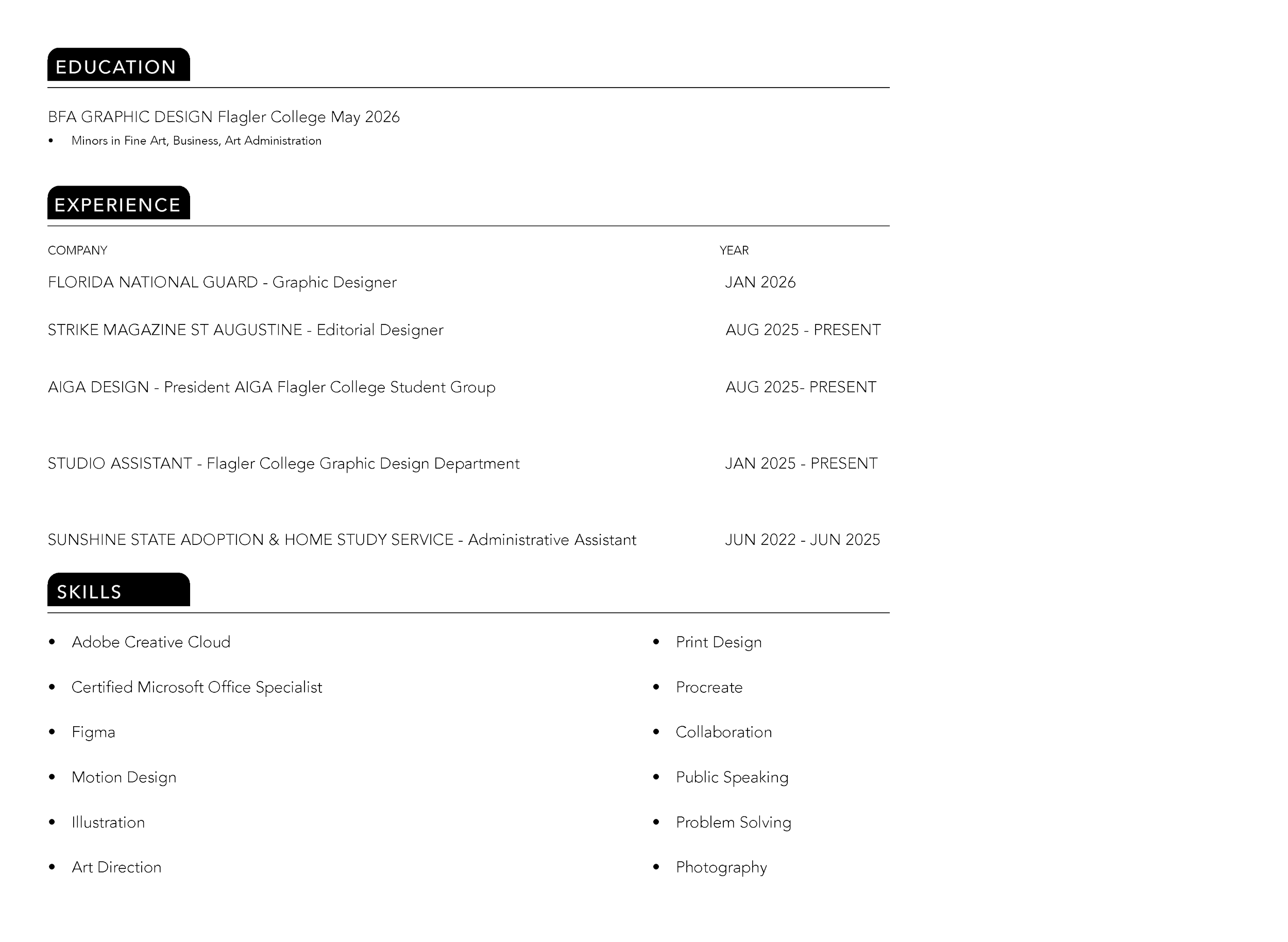 Alongside my studies, I’ve served as President of AIGA, worked with Strike Magazine, interned with the Florida National Guard, and spent three semesters as a Studio Assistant in the Graphic Design Department. Outside of design, I run my small business, Hewitt Art, where I sell handmade print goods and artwork at local markets. Whether I’m designing digitally or creating by hand, I’m passionate about making work that celebrates thoughtful, everyday moments.