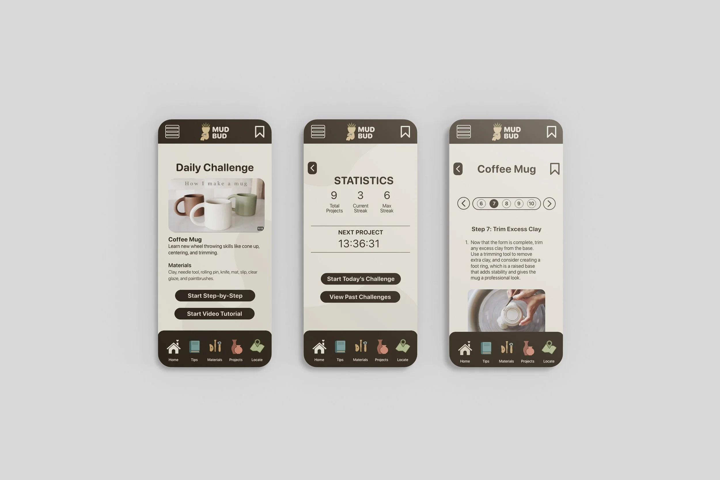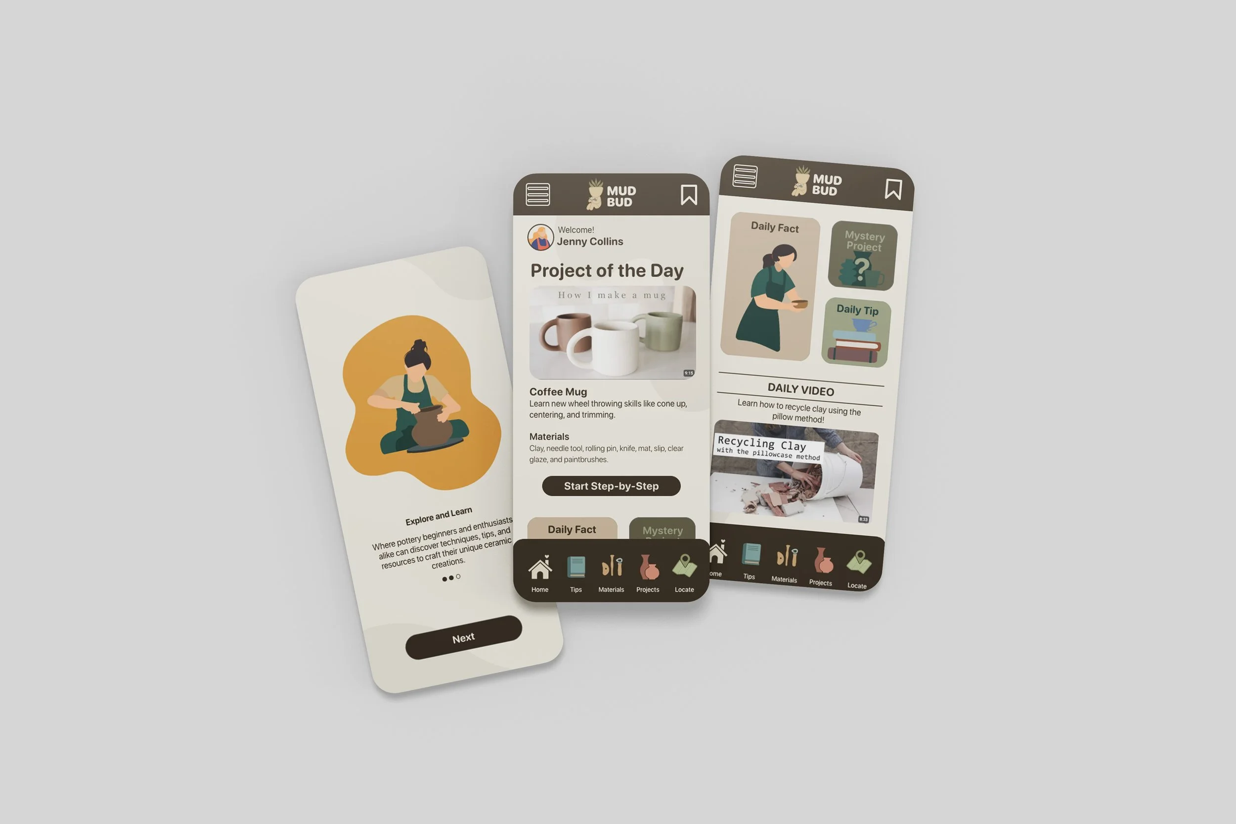 MUDBUD is a pottery-focused mobile app designed to make ceramics more accessible for beginners while supporting continued growth for more experienced users. The app provides step-by-step project guidance, educational resources, and tools to help users learn techniques, understand materials, and confidently create their own work. A friendly visual system, grounded in earthy tones and simple iconography, reflects the tactile and approachable nature of clay. The MudBud character adds personality and guidance throughout the experience, reinforcing the app’s supportive tone. By combining education, creativity, and usability, MUDBUD creates an engaging digital space that encourages users to explore pottery and build confidence in their skills.